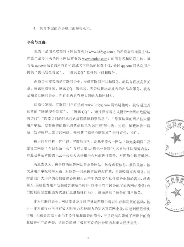 今日头条表示,腾讯利用垄断地位以各种理由、多次进行不正当竞争的行为。针对其中的“腾讯QQ空间拦截、屏蔽头条网页链接”, “腾讯安全管家作为安全软件拦截、屏蔽头条网页链接”,今日头条已经起诉腾讯,目前两案都已于6月1日获得海淀区人民法院立案,相关证据都已经提供给法院。今日头条要求腾讯公司立即停止一切不正当竞争的行为,公开赔礼道歉同时赔偿今日头条公司共计9000万元人民币的经济损失。