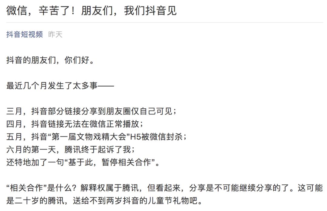 随后,今日头条旗下产品抖音短视频发文称:“相关合作”是什么?解释权属于腾讯,但看起来,分享是不可能继续分享的了。文中还表示:朋友圈就留给微视吧,抖音也累了,每次解释被封杀,还要被人称为“戏精”。