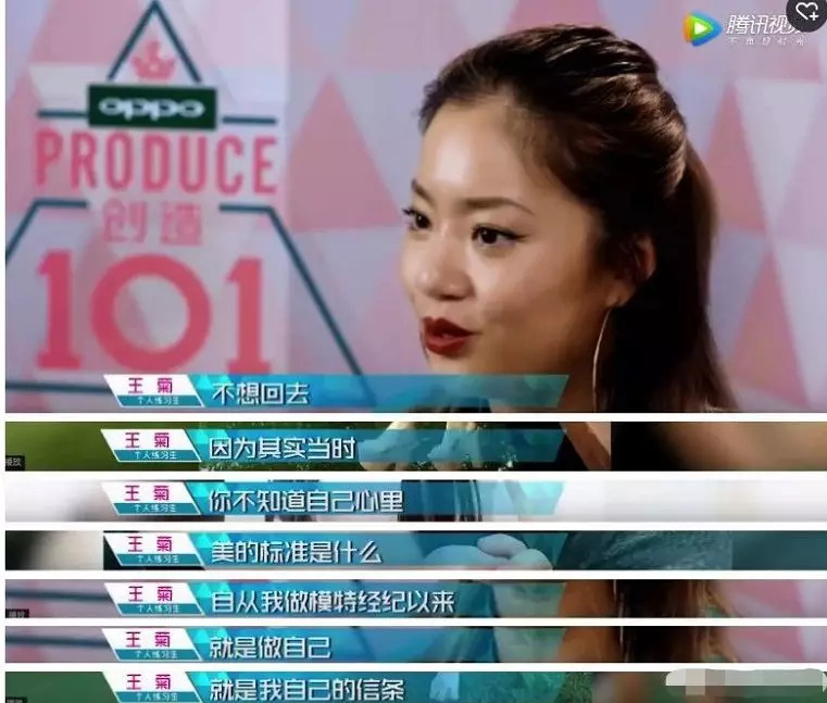 王菊原本没有参加《创造101》,上海英模去面试的时候,她作为经纪人就在玻璃门外面看着,面试结束的时候她突然推门进去,说:“我能试一试吗?”