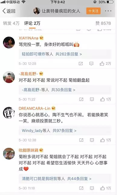 而王菊的粉丝,在微博下排列起了整齐的队形。