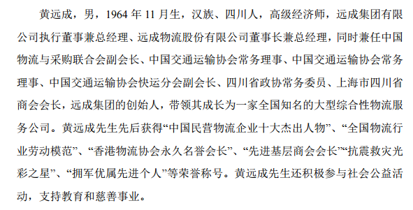 根据上市公司与重庆远成物流签署的《远成物流盈利补偿协议》,此交易的业绩补偿期为2018年度、2019年度和2020年度。重庆远成物流承诺远成物流在2018年度、2019年度和2020年度实际实现的合并口径扣除非经常性损益后归属于母公司所有者的净利润分别不低于2.5亿元、5.4亿元和7.8亿元。至于这个重庆远成物流,当然也是黄远成旗下资产。