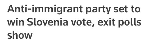 【斯洛文尼亚反移民党派有望在议会选举中获胜】斯洛文尼亚中间偏右的反移民反对党在周日的大选中有望获胜,根据当地电视台TV Slovenia的投票站出口民调,该党获得24.4%的选票。