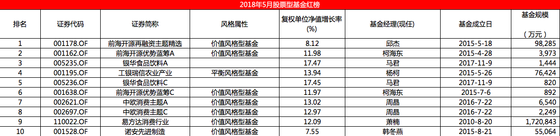 排在第一位的是前海开源再融资主题精选(001178),由基金经理邱杰管理,上月净值增长率8.12%。同公司旗下上榜的还有前海开源优势蓝筹A(001162),二者风格均以大中盘价值风格为主。