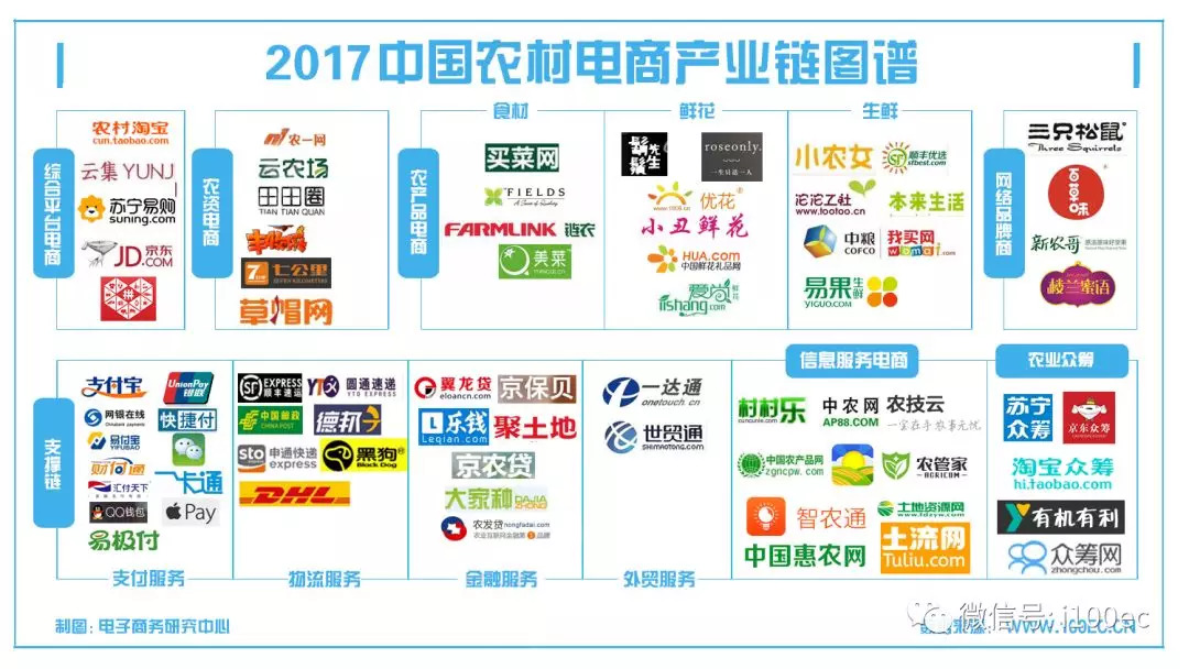 据报告显示,目前农村电商市场存在以下七大类玩家:1)综合平台电商:京东、云集、农村淘宝、拼多多、苏宁等;2)农资电商:云农场、一亩田、田田圈、草帽网等;3)农产品电商:买菜网、链农、美菜等;4)网络品牌电商:三只松鼠、百草味、新农哥等;5)生鲜电商:小农女、我买网、本来生活、田田圈等;6)信息服务类:村村乐、智农通、中农网等;7)农业众筹类:有机有利、京东众筹、淘宝众筹、苏宁众筹等。