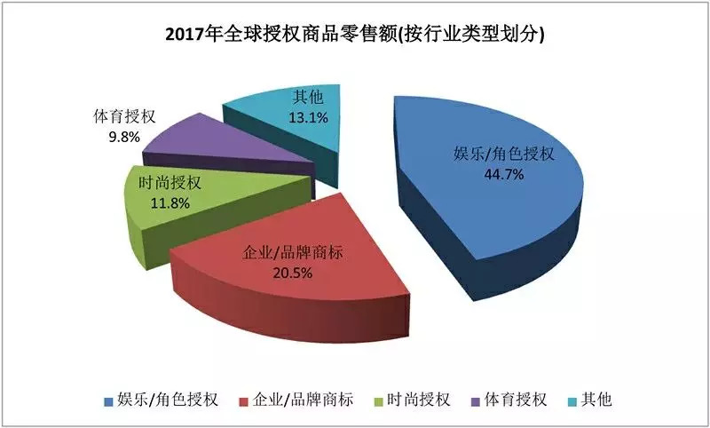 根据国际授权业协会公布的《2018年全球授权业市场调查报告》显示,2017年全球授权商品零售额达到2716亿美元,其中娱乐/角色授权占据44.7%的市场份额。北美地区依然是全球最大授权市场,但东北亚地区增长十分强劲,同比去年增长了6.2%。