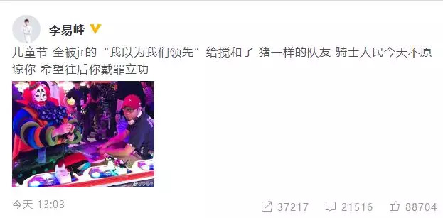 6月1日,李易峰更新微博,晒出一张片场花絮照,配文:“儿童节,全被jr的‘我以为我们领先’给搅和了,猪一样的队友,骑士人民今天不原谅你,希望往后你戴罪立功。”