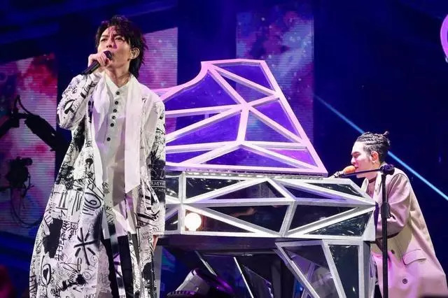 伴随着缓缓升起的高台,林宥嘉出现在舞台上。当初的星光大魔王与星光冠军,世纪大合体,十年来首次同框,全场都嗨爆了!