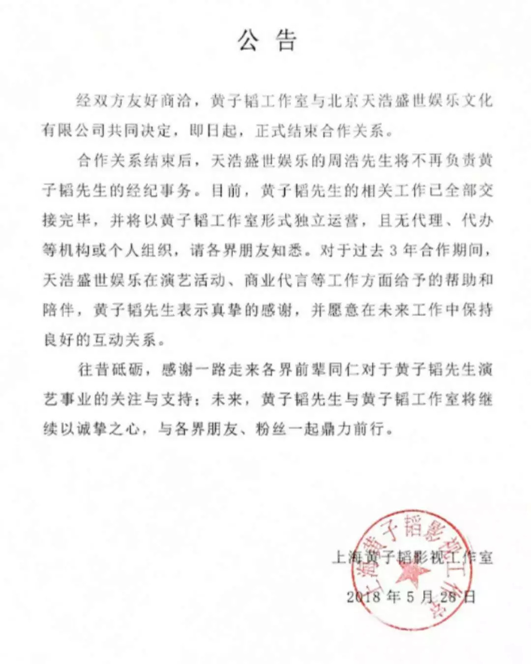 昨天,黄子韬工作室发了一个微博,表示与天浩盛世解约,成立独立工作室。