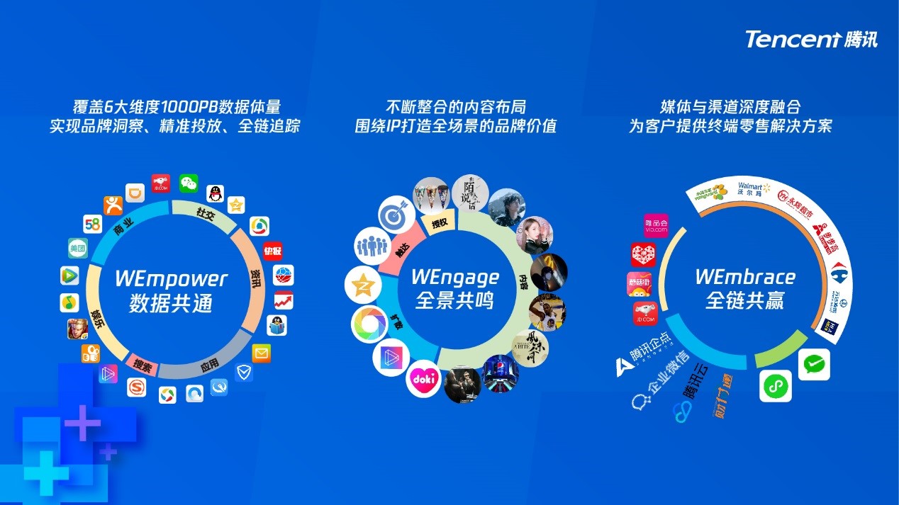 在腾讯WE+营销体系中,数据共通(WEmpower)、全景共鸣(WEngage)、全链共赢(WEmbrace)是三大核心能力,每项能力均有不同的侧重点。