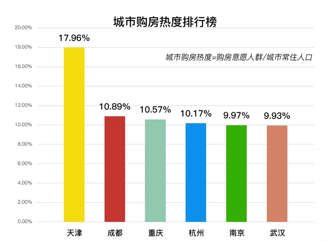 艾普英捷大数据显示,自从5月16日天津落户新政发布,这个楼市一度沉寂的城市瞬间爆红,当月购房热度高达17.96%,以压倒性优势反超去年的成交大户重庆、成都。除天津外,其余几个新一线城市热度旗鼓相当,均保持10%左右的水平。