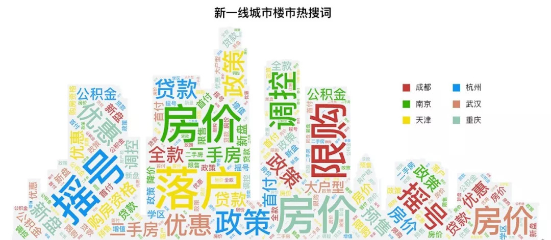 提到买房,新一线的用户最关心什么?用户网络搜索行为数据显示,天津的购房者最关心资质问题,比如落户和购房资格;杭州、成都这两个曾经爆红的城市最关心政策,比如摇号、限购、贷款、公积金等;重庆、南京、武汉的购房者比较实际,房价、优惠这类和钱相关的关键词,均排名靠前。