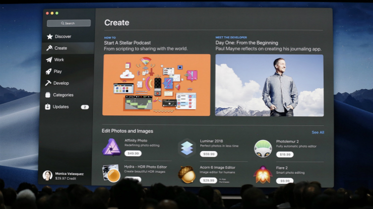 macOS Mojave将一些iOS中的应用移植过来,包括Apple News、语音备忘录、智能家居控制软件Home等。macOS Mojave的应用商店也借鉴iOS的App Store进行改版,新增视频预览、编辑推荐评语,应用评级等。