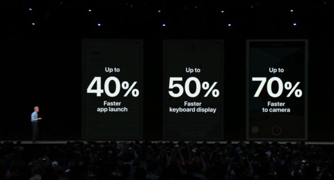 速度成了iOS 12的关键词。根据发布会的数据显示,在iOS 12之下,App打开速度将提高40%,键盘速度提高50%,在旧款设备上打开相机的速度提高了70%。不难看出苹果正专注于提高旧设备的性能。