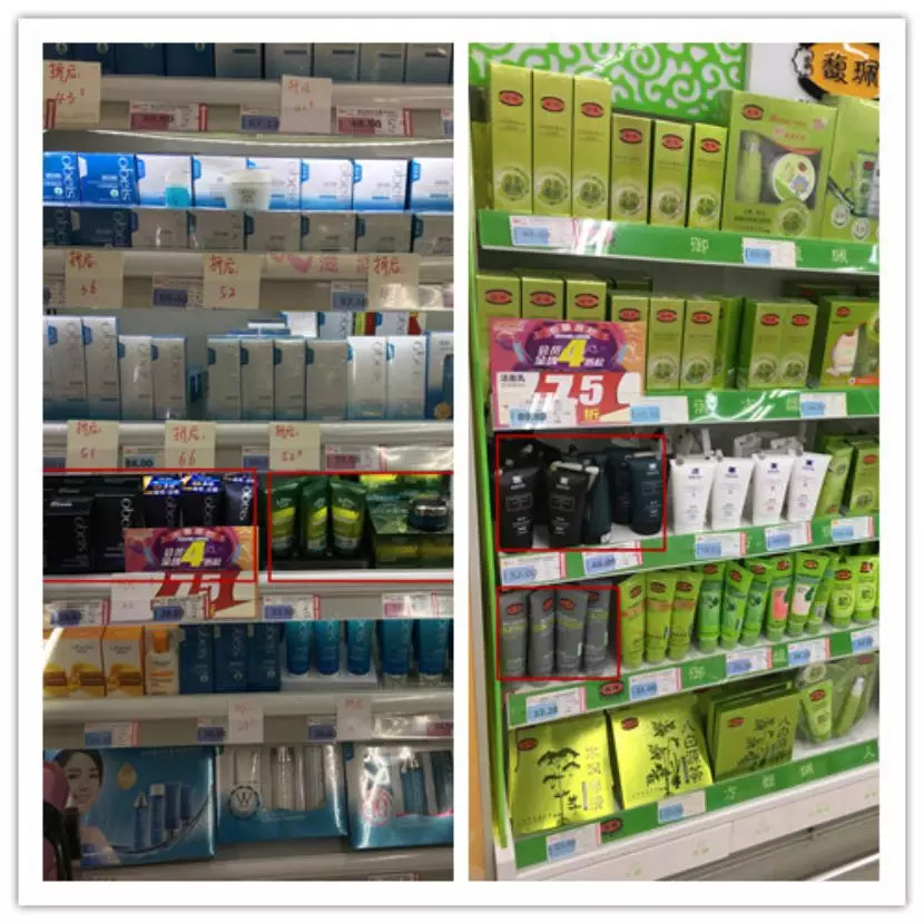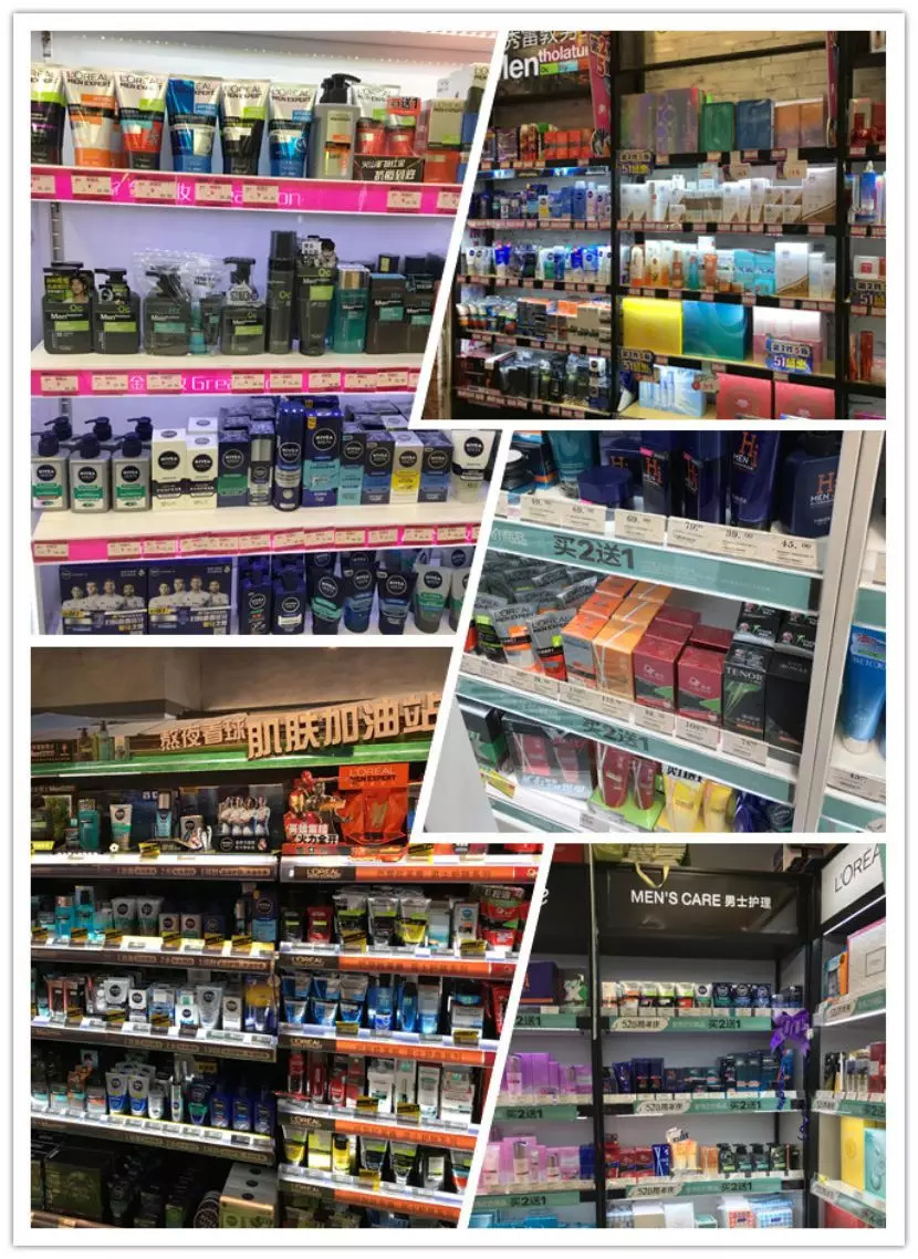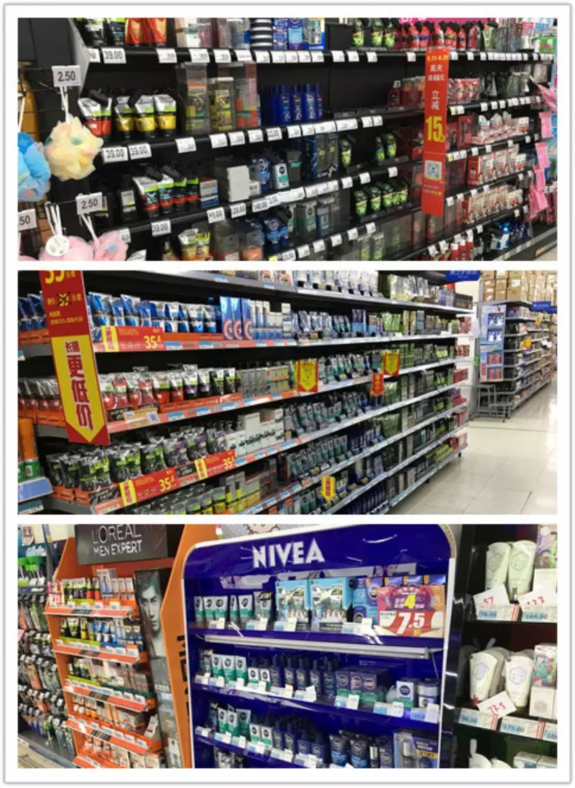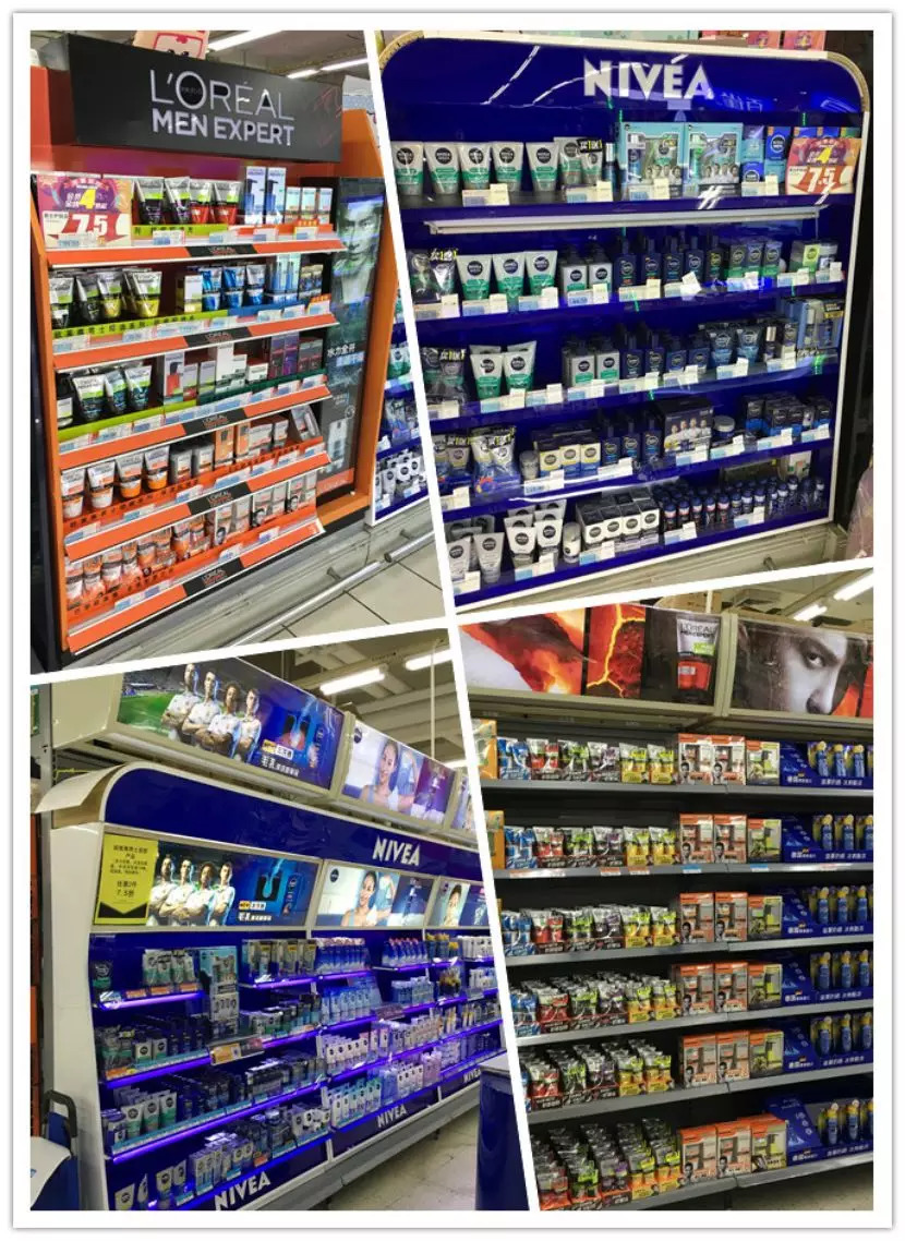 林子通过走访家乐福、沃尔玛、中商平价等线下商超发现,男士护肤仅欧莱雅、妮维雅在陈列上有独立的货柜及品牌形象,其他品牌则是和女士护肤品堆放在一起,没有单独的形象展示。