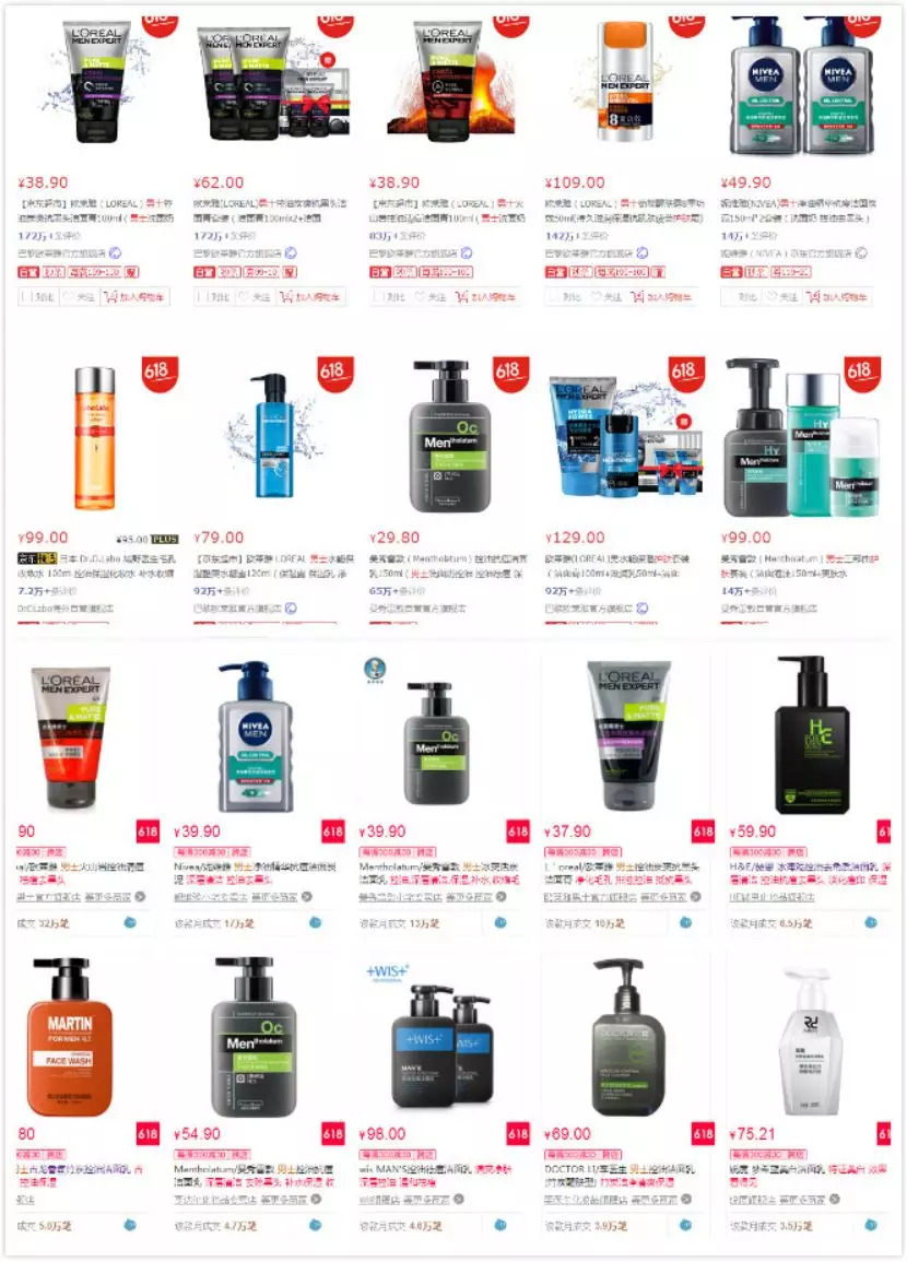 随着互联网用户群体的增多,线上渠道成为男士系列开疆拓土的重要阵地。如欧莱雅去年在京东超市“型男节”中,凭借狼人杀IP实现了销售额同比增长100%;妮维雅也在618期间为京东定制病毒视频,使主推的精华走珠液销量环比增长470%。除此之外,曼秀雷敦、韩束等均表现活跃。