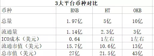 BNB总发行量2个亿,50%用于ICO公开发行,40%创始团队早期持有,10%天使轮融资;HT为了避开发币的名义搞了积分的模式,购买点卡送HT,总发行5个亿,3个亿用于点卡赠送,1个亿用于奖励用户与平台运营,另有一个亿用于团队激励。