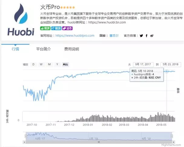 从图中看出火币交易量从2017年10月份中旬到2018年2月份一直增长。2018年2月后,增长基本停滞,大约为92亿日交易量。
