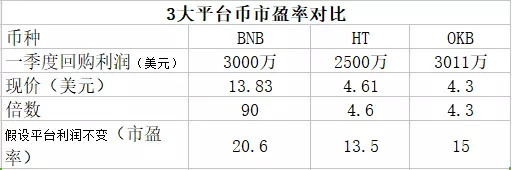 币安用季度利润的20%回购BNB并销毁。币安三个季度回购的金额分别是150万美金、4000万美金和3000万美金。火币同样用利润的20%回购HT,但并不销毁(用于突发事件对客户的赔偿)。火币一个季度的收购金额在2500万左右。OKB是分红模式,用每周利润的50%分红。现在OKB流通量3亿,算下来一季度大约分3011万美元。