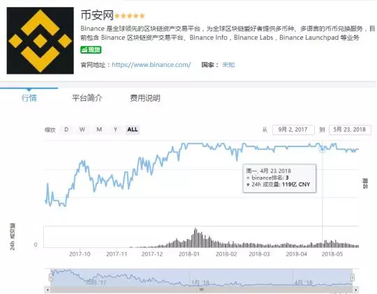 从图中看出币安交易量从2017年7月份到2018年1月份一直增长。2018年1月后,增长基本停滞,大约为120亿日交易量。