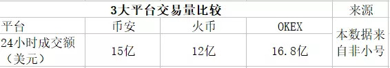 从交易量上看OKEX>币安>火币,但整体上三个平台交易量都暂时增长停滞。三个平台也有各自的生态,币安有Binance Lab、Binance LaunchPad和Binance info,火币有火币矿池、火币基金、火币超级节点等,OKEX在生态建设上稍显逊色,暂未公布其它生态建设。