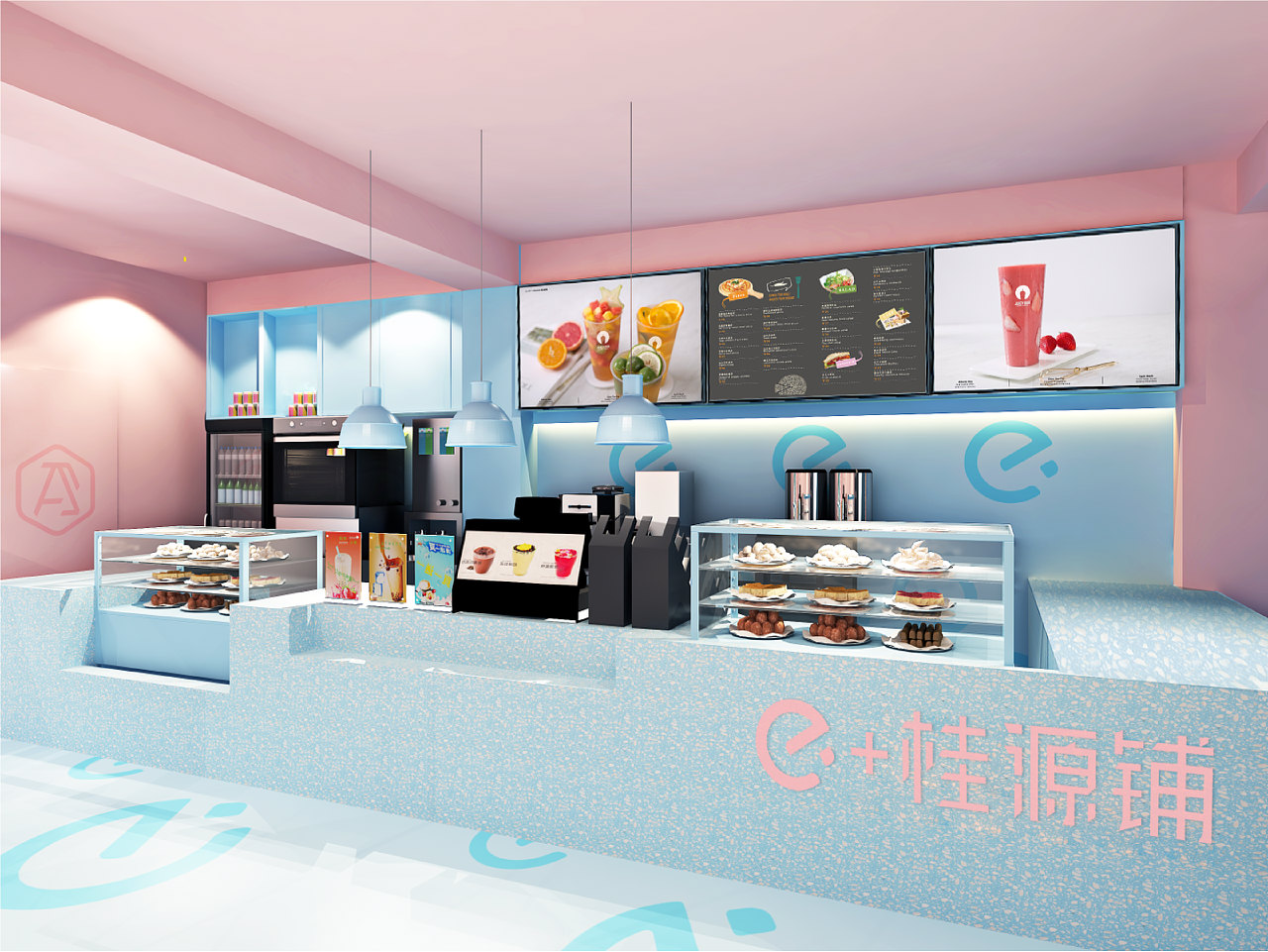 今年1月,饿了么和桂源铺合作,在上海开了一家“e+桂源铺”Half主题甜品店:店铺一半蓝色一半粉色的设计装修,桂源铺的色彩和饿了么logo进行的混搭;就连食品和包装文案都是两个品牌联名定制的。
