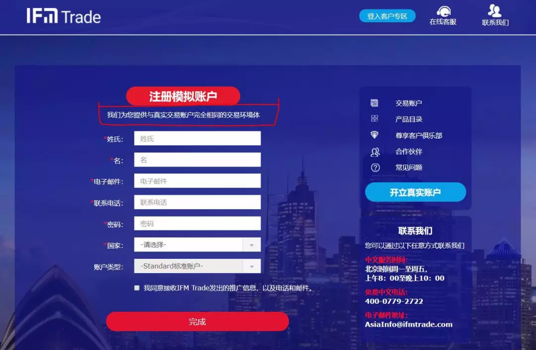 以澳洲ASIC监管的券商IFM Trade为例,开设模拟账户前,会有一些提示语和默认选项,客服热线的服务时间等。投资者务必要留意一些提示语,以确保模拟环境和真实环境一致性,没有额外的要求和模拟版本的隐藏成本,同时,要留意网站上是否在醒目的位置提供客服联系方式。这能确保在市场开放时间,任何账户操作的问题都能及时获得沟通与处理。