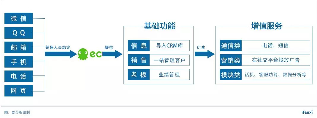 EC增值服务主要包括三类:第一类是通信类,包括话机、电话、短信服务;第二类是营销类,主要是帮助企业通过EC的大数据在社交广告平台投放广告;第三类是模块类,包括销售漏斗、大数据分析、业务流程等等。