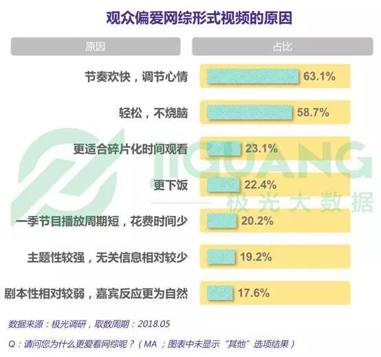 根据极光大数据,超六成观众表示相对于电影、电视剧等视频形式,节奏欢快、易于调节心情是他们更为偏爱网综的重要原因;其次,轻松不烧脑也是网综相对电影、电视剧等对观众更友好的地方。