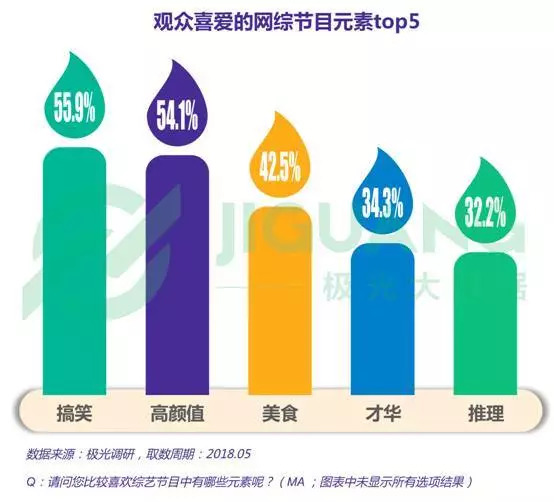 极光调研数据显示,搞笑是网综观众最为喜爱的节目元素,高颜值和美食等要素也吸引了不少观众的目光。才华受到三成网综观众的关注。