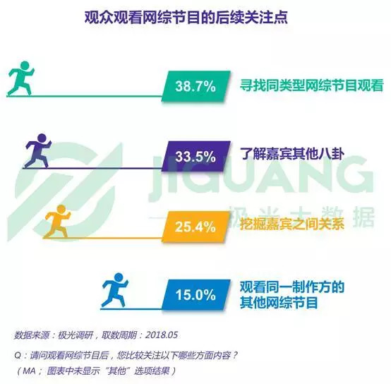 现象级网综节目可带动同类型网综节目发展。极光大数据发现,近四成网综观众会在观看某网综后寻找同类型网综节目观看,而三成观众表示希望了解嘉宾在网综节目之外的其他八卦。