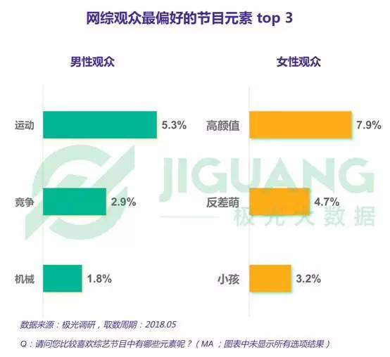 运动、竞争和机械更受男性网综观众欢迎,而女性观众则钟情于高颜值和反差萌要素,对萌娃更是完全没有抵抗力。
