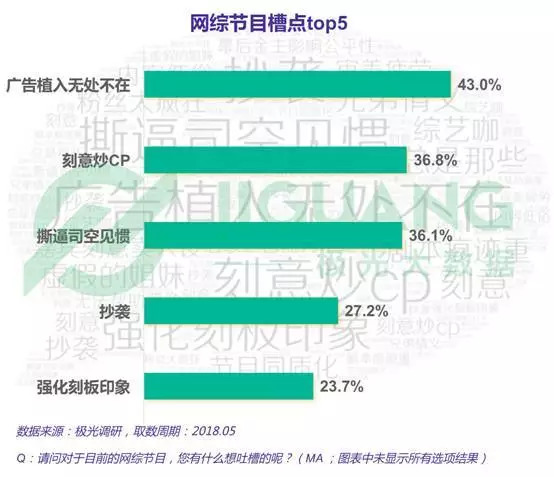 极光大数据发现,无处不在的广告植入是观众最为不满的地方,此外刻意炒CP也让观众觉得十分尴尬。而节目组之间、节目组和嘉宾之间、嘉宾和嘉宾之间翻来覆去的撕逼更是让观众觉得十分心累。