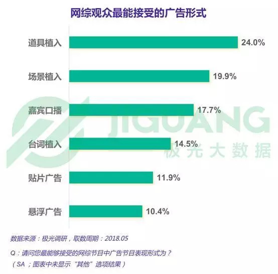 根据极光大数据,网综观众最能接受的广告形式为道具植入,其次为场景植入。传统的悬浮广告和贴片广告形式观众接受度最低。