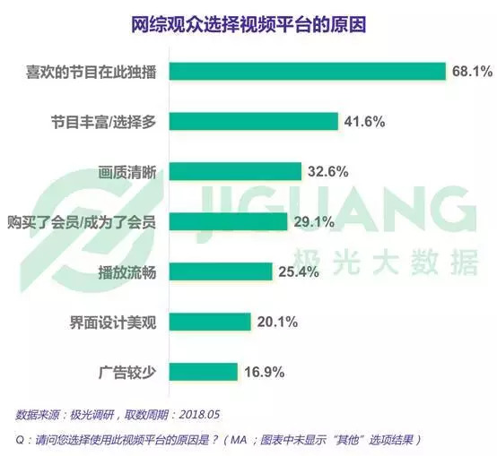 极光调研发现,约七成观众选择目前所使用的视频平台是因为喜欢的节目在此平台独播。由此可见,视频平台需要不断为观众提供优质内容才能留住观众的心,而节目的丰富性也影响到观众对视频播放平台的选择。