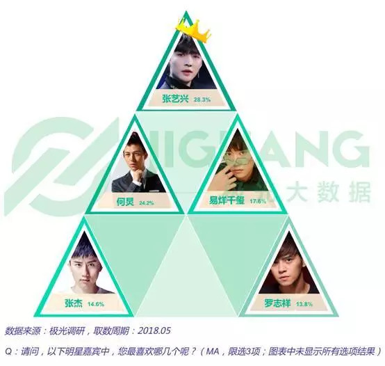 节目与明星嘉宾是互相成全的关系。《偶像练习生》的大火,不止让新人练习生俘获不少观众的芳心,张艺兴作为节目导演(program director,简称PD)也登顶网综观众最喜爱的明星嘉宾。手握《拜托了冰箱第四季》等节目的何炅、在《创造101 》中担任嘉宾的罗志祥、张杰,在《这!就是街舞》中担任导师的易烊千玺,均收获不少网综观众的喜爱。