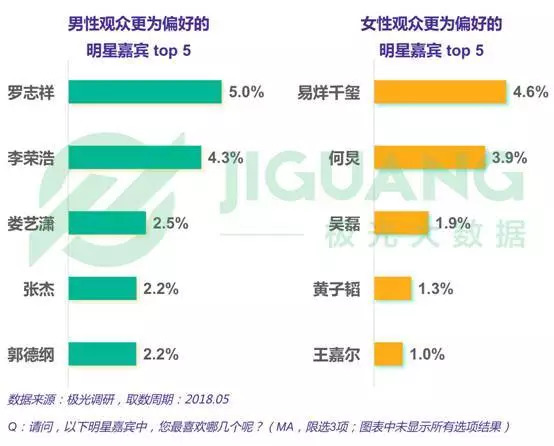 极光大数据发现,男性网综观众相对整体网综观众,更喜欢罗志祥、李荣浩和娄艺潇,而易烊千玺、何炅、吴磊等明星则更招女性观众喜欢。