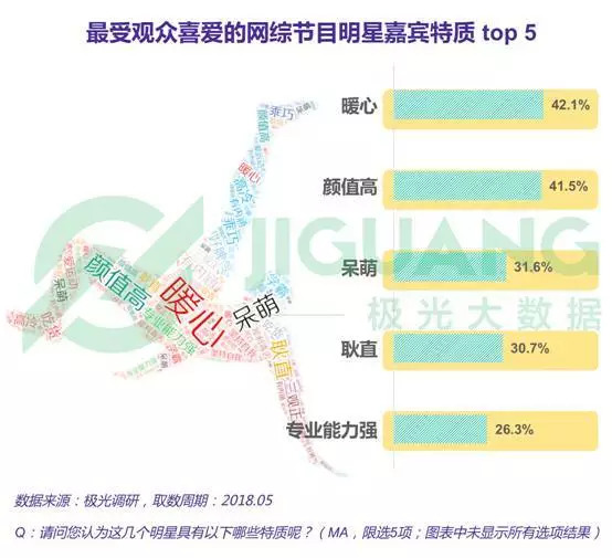 极光调研发现,颜值和性格是明星嘉宾圈粉的重要因素。超过四成的网综观众认为自己喜欢的明星嘉宾颜值高,暖心、呆萌和耿直是受到网综观众青睐的重要性格特质。专业能力强也会吸引大量网综观众的关注和喜爱。