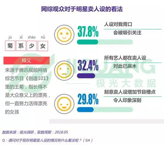 根据极光大数据显示,约四成网综观众并不反感明星卖人设,表示如果明星卖的人设恰好对自己胃口的话,会更为关注这个明星。