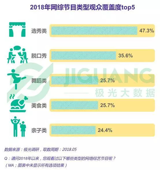 极光调研发现,选秀类节目观众覆盖度最高,每100个网综观众中就有47个看过选秀类的网综节目。2018年以来,约一半的网综观众看过选秀类网综节目。而《吐槽大会第二季》、《奇葩大会第二季》等优质网综节目的续集,也吸引了超过三成网综观众观看。