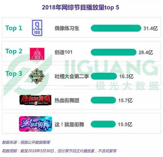 截至2018年5月底,由爱奇艺打造的男团选秀节目《偶像练习生》狂揽31.4亿播放量,腾讯视频打造的女团选秀节目《创造101》播出仅六期,已达到28.4亿播放量。脱口秀《吐槽大会第二季》、街舞类节目《热血街舞团》和《这!就是街舞》播放量也均在15亿以上。