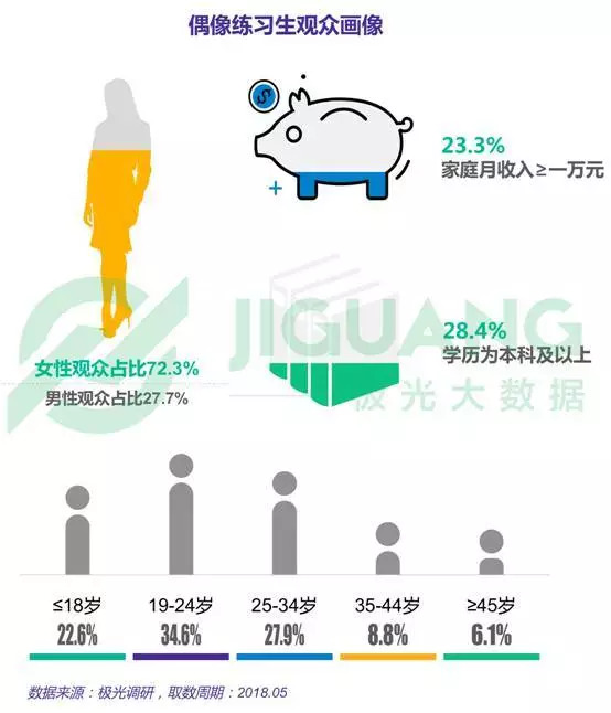 极光大数据发现,《偶像练习生》观众以19-24岁、女性为主,约三成观众为本科及以上学历。因受访者中学生及年轻未婚白领较多,仅23.3%月收入超过一万元。
