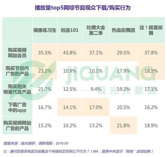 明星网综“吸金力”强。极光调研数据显示,43.8%的《创造101》观众购买了视频网站会员,此占比高于其他网综节目。20%以上喜欢《偶像练习生》的观众购买过节目内广告的产品,14.1%喜欢《创造101》的观众下载过广告中的app。