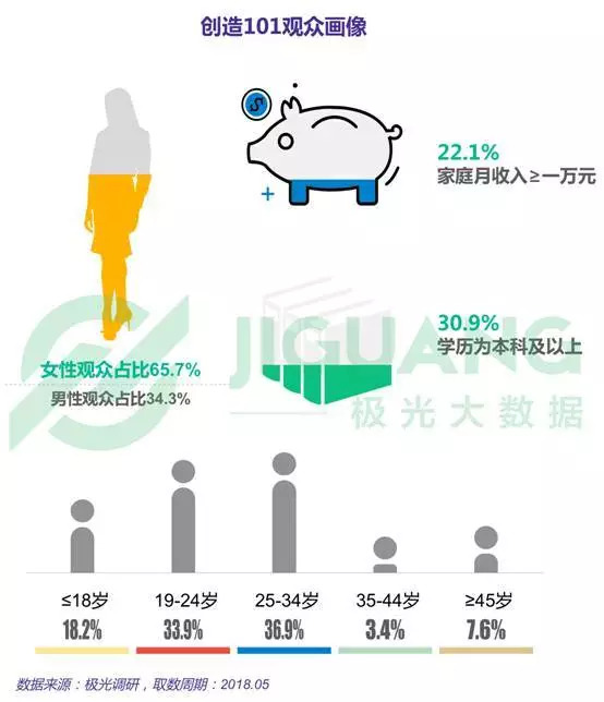 根据极光大数据,《创造101》观众中30.9%为本科及以上学历,25-34岁观众占比最多,其次为19-24岁观众。