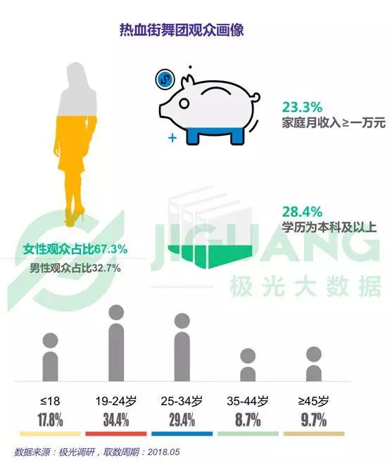 极光大数据发现,超过三成《热血街舞团》观众为19-24岁观众,家庭月收入过万的观众占比为23.3%。