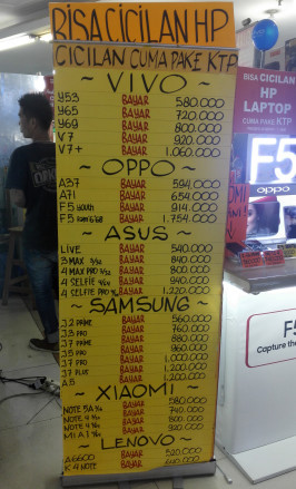 OPPO展台的一位本地员工Jason告诉《棱镜》,目前该商场提供手机分期消费的进驻平台有捷信和唐牛(Tangbull)两家,唐牛就是一家来自中国的手机分期平台,2016年10月在印尼上线,据其创始人何飞讲述,三个月后公司就实现了盈利。