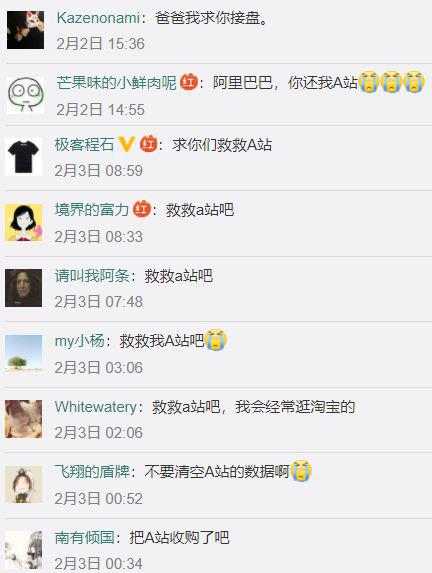 今年2月A站宕机后,由于业界传闻阿里旗下基金要入股A站,加之A站此前使用阿里云服务。Acer们纷纷跑到阿里巴巴官方微博评论区哭诉,求爸爸接盘A站——