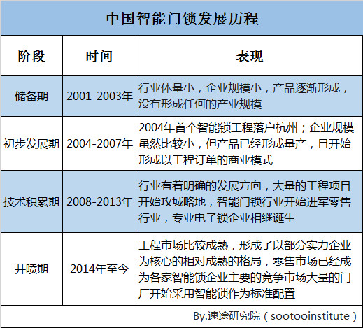中国智能门锁行业从2001年到2013年,经历了储备期、初步发展期、技术积累期,自2014年起,中国智能门锁开始逐渐走向行业井喷期。