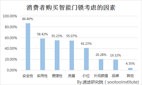 根据消费者购买智能门锁考虑因素的调查结果显示,86.8%的消费者重视智能门锁的安全性,其次消费者考虑最多的便是实用性和便捷性,再有就是质量。