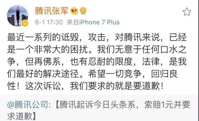 6月1日晚间,腾讯宣布与“今日头条”及“抖音”系列产品的实际运营者北京字节跳动科技有限公司、北京微播视界科技有限公司暂停相关合作,并发布公告称,上述两家公司涉商业诋毁及不正当竞争,对腾讯声誉造成严重影响,即日起于北京市海淀区人民法院正式提起诉讼。同时,腾讯要求两公司赔偿人民币1元,并在自有新闻媒体平台全量推送公开道歉。