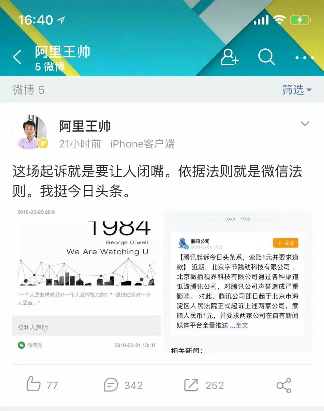 但也有人提出了不同的看法。就在今日头条和腾讯“战事升级”之时,阿里站出来力挺头条。6月1日,阿里巴巴市场委员会主席王帅在微博表示,“这场起诉就是要让人闭嘴。依据法则就是微信法则。我挺今日头条。”此前有传闻称阿里有意投资今日头条,对此王帅曾予以否认。不过据媒体报道,阿里与今日头条在内容、流量等业务方面已经展开合作。